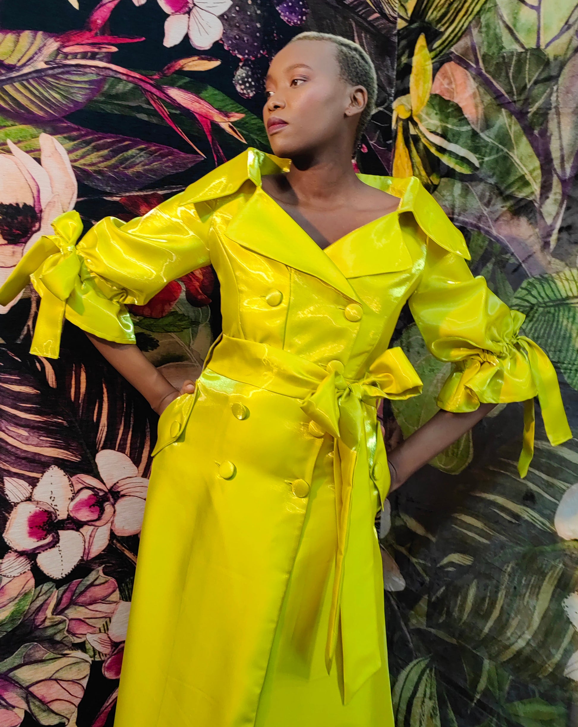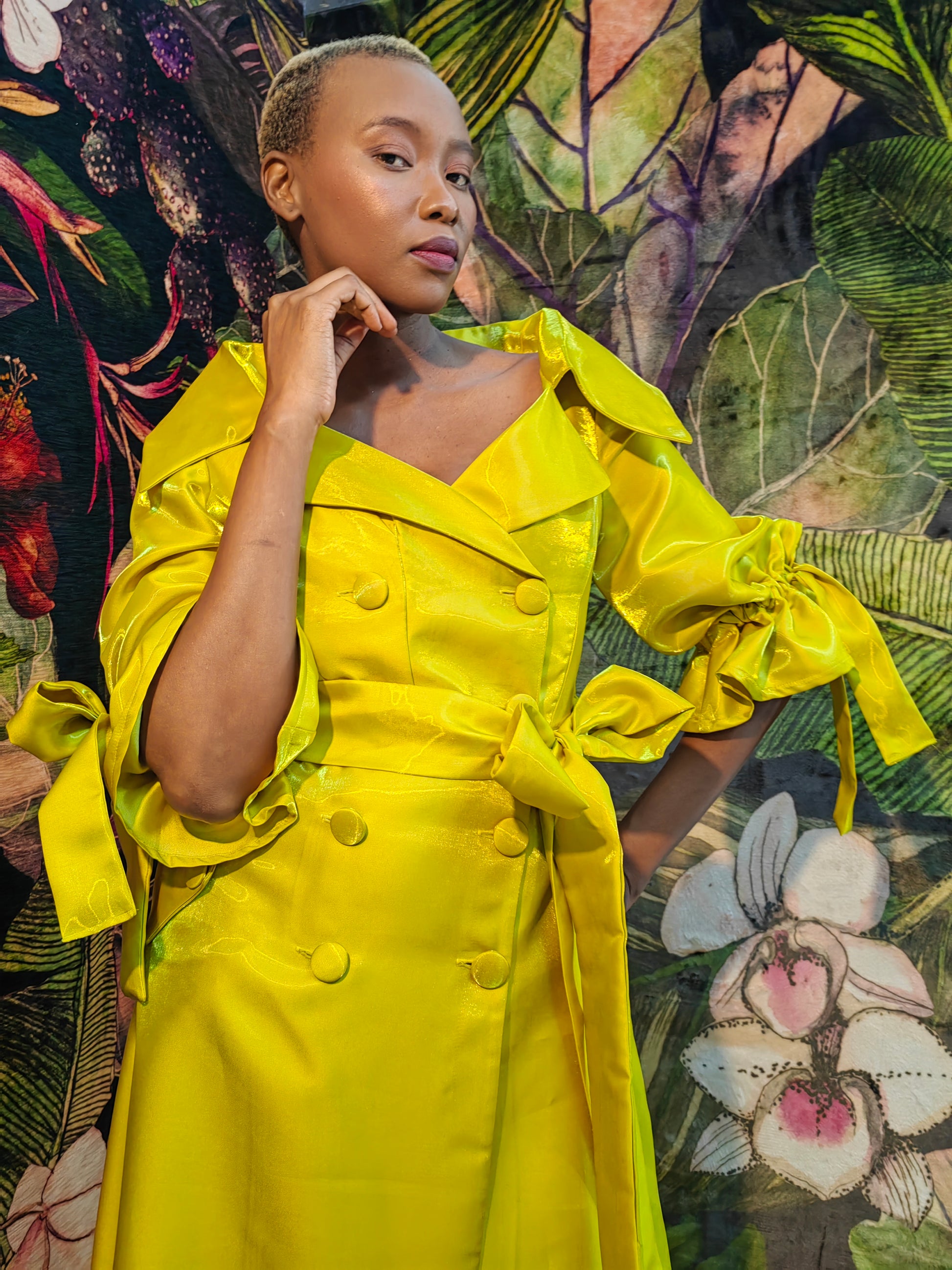 Chartreuse iridescent satin double breasted off-the-shoulder dress