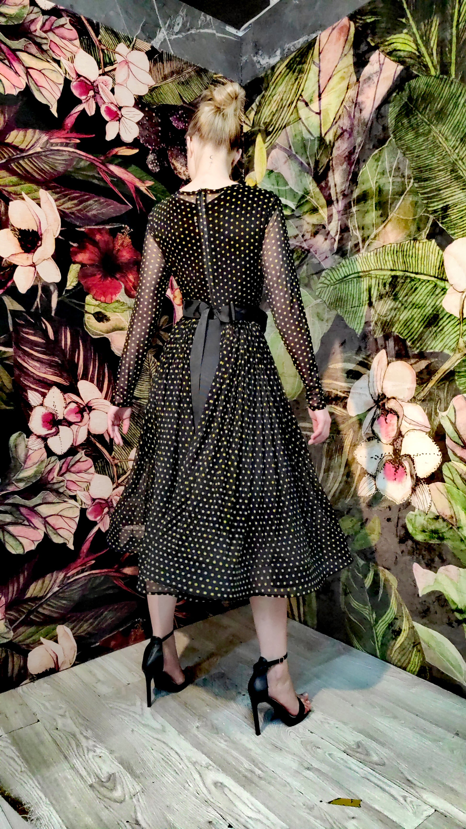 Stretch mesh dress long sleeve dress with full skirt with crinoline band in hem for flare.