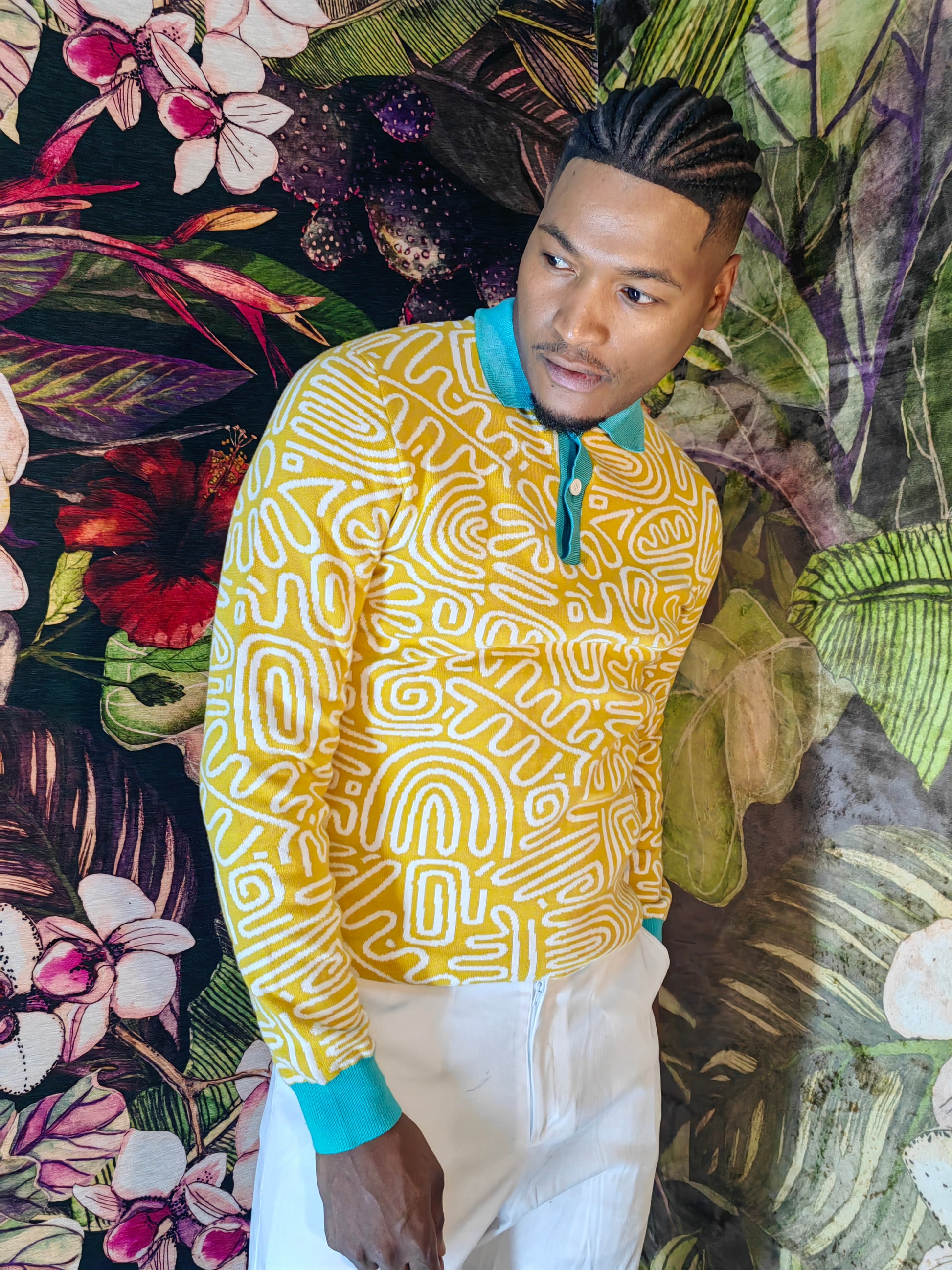 Pure cotton long sleeved knit golfer with geometric maze design and contrast details