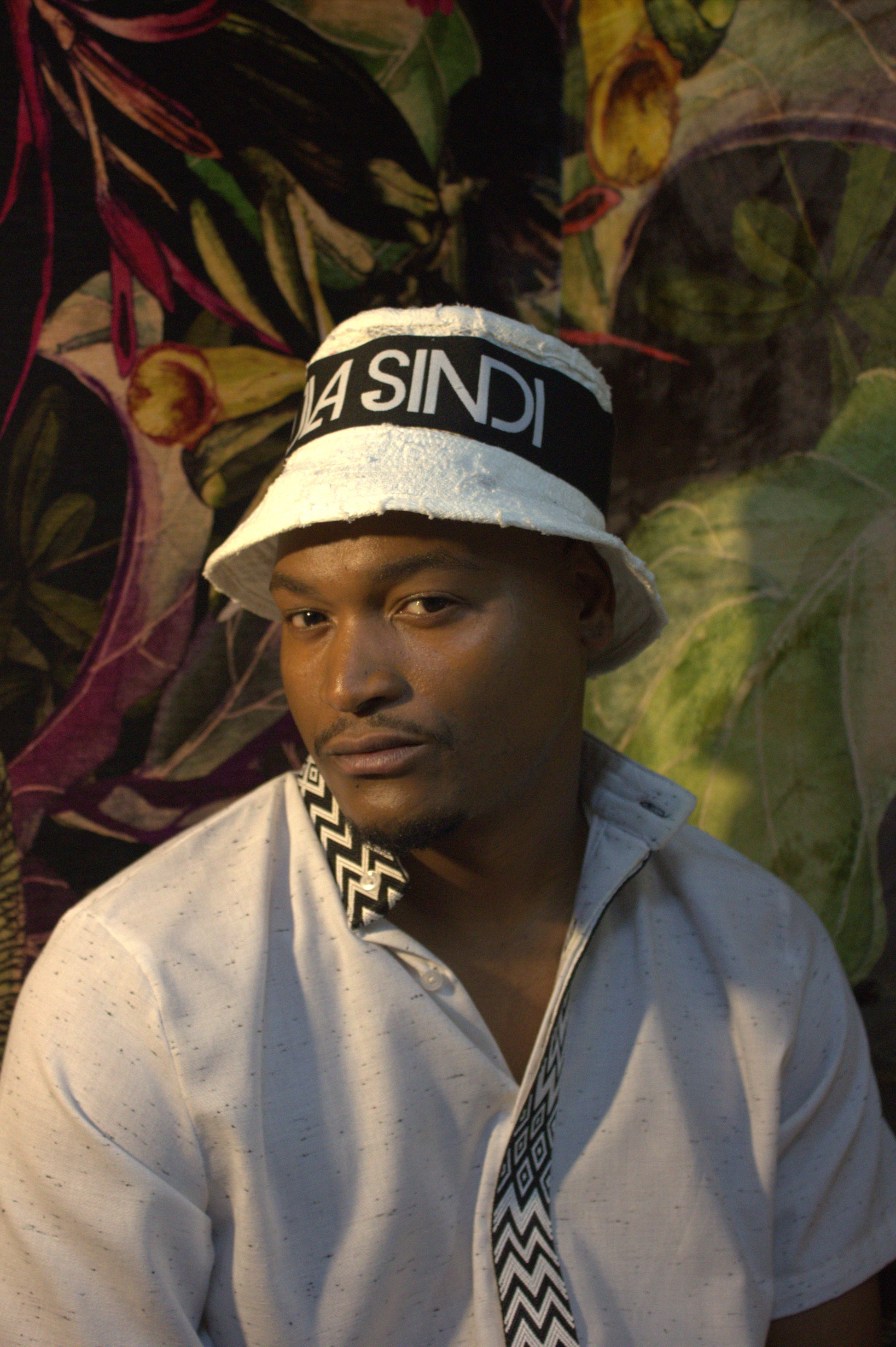 Artfully distressed white denim bucket hat with Thula Sindi logo .